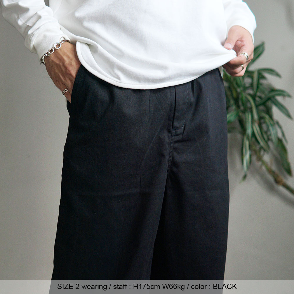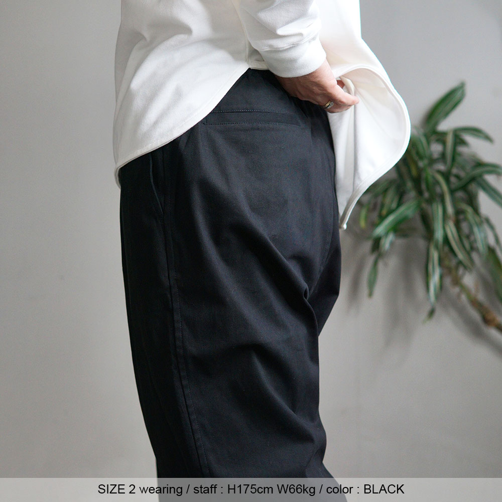 ・サイズ2・・・モモ周りからヒップにもしっかりとゆとりがあり、よりリラックスしたサイズ感です。ウエストはこちらもゴムが腰位置でとまるサイジングで、裾はシューズに1クッションかかるレングスです。 推奨170cm(ややオーバーフィット)〜180cm(ジャストフィット)で、よりワイドorリラックスしたサイズ感で着たい方はこちらのサイズがおすすめです。