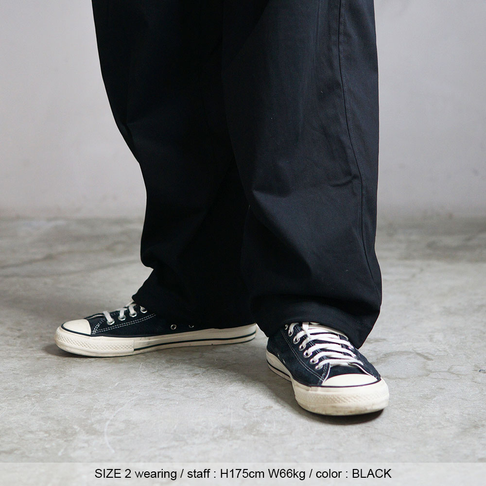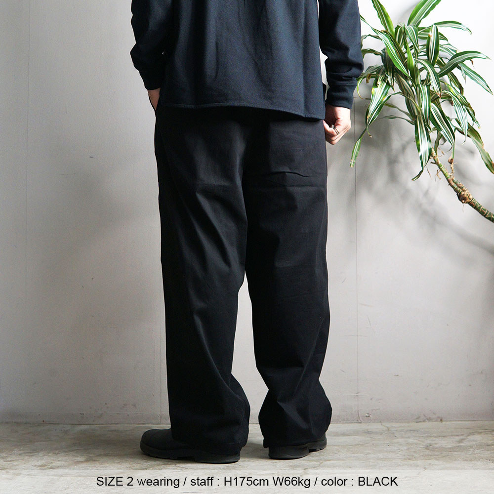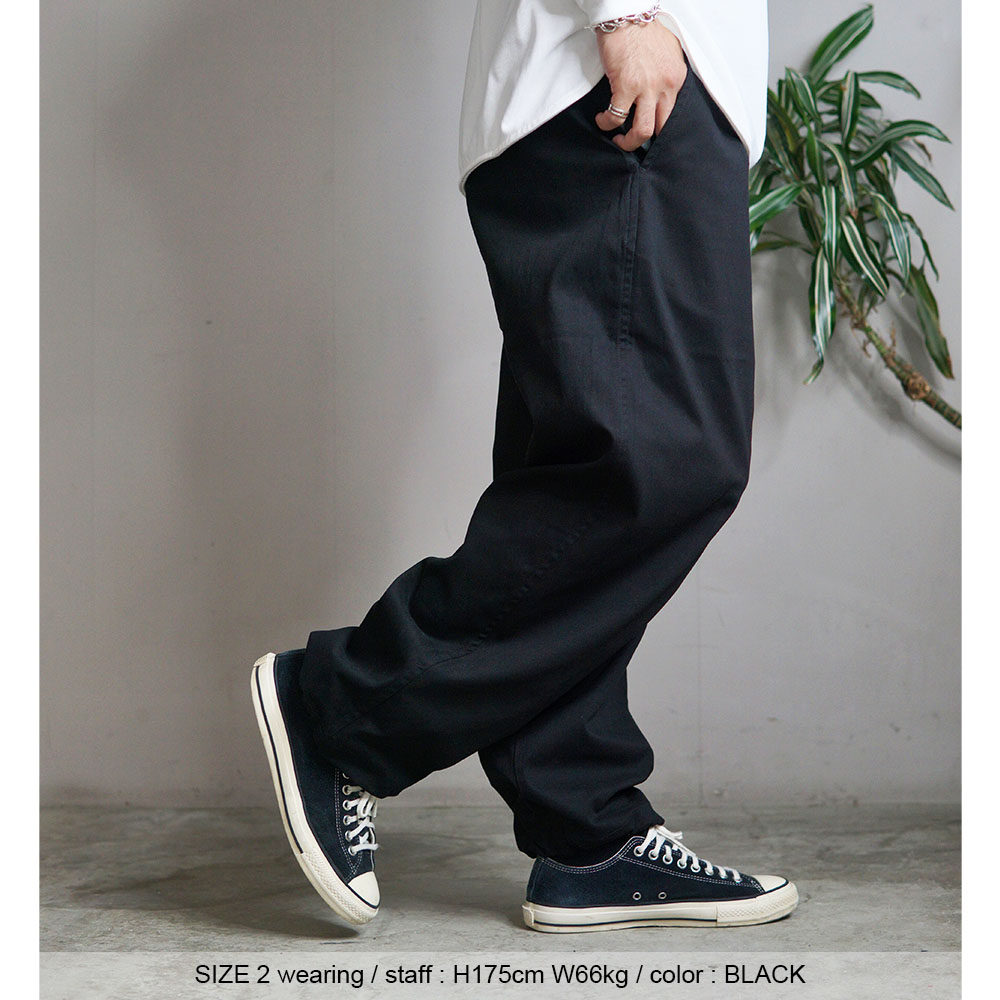 ・サイズ1・・・ゆとりをもたせた設計ながら、野暮ったさは感じないストレートシルエットでの着用感です。ウエストはドローコードを通していますがゴムが腰位置でとまるサイジングで、裾がシューズにかかる長さです。推奨身長は165cm(ややオーバーフィット)〜180cm弱(レギュラーストレート)迄の方、細身の男性の方や女性の方はサイズ1がおすすめです。