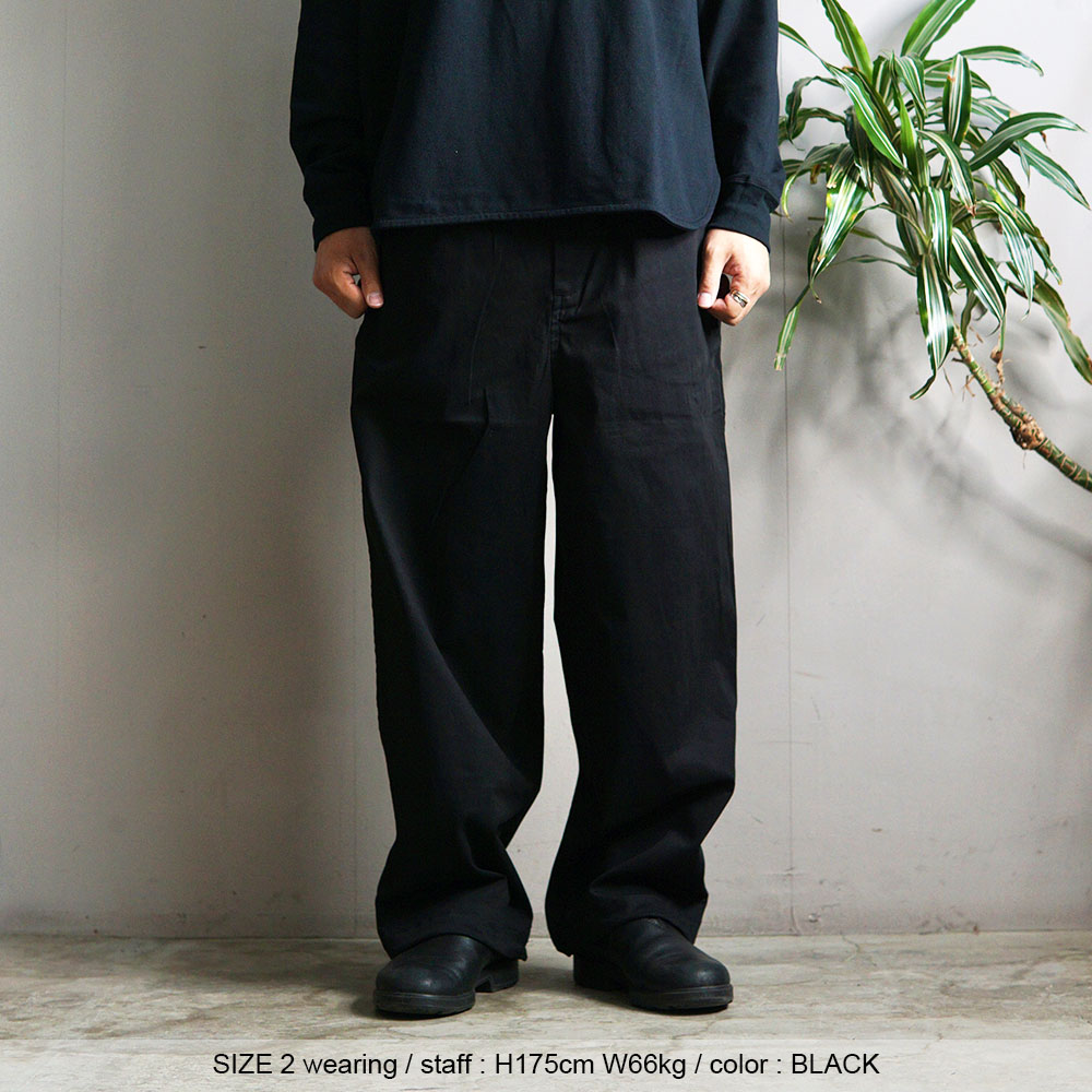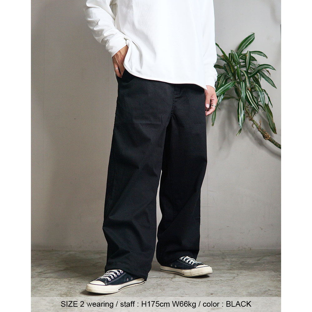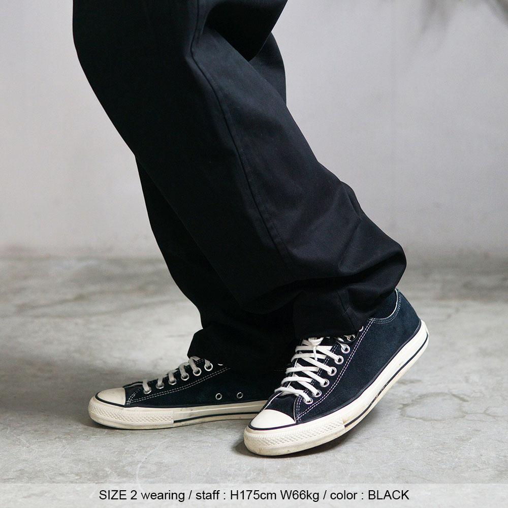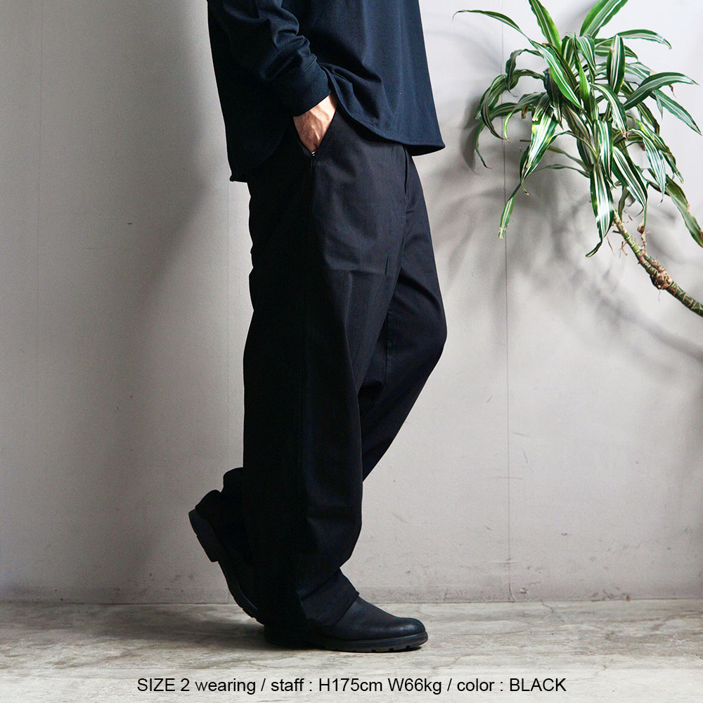 ・サイズ1・・・ゆとりをもたせた設計ながら、野暮ったさは感じないストレートシルエットでの着用感です。ウエストはドローコードを通していますがゴムが腰位置でとまるサイジングで、裾がシューズにかかる長さです。推奨身長は165cm(ややオーバーフィット)〜180cm弱(レギュラーストレート)迄の方、細身の男性の方や女性の方はサイズ1がおすすめです。