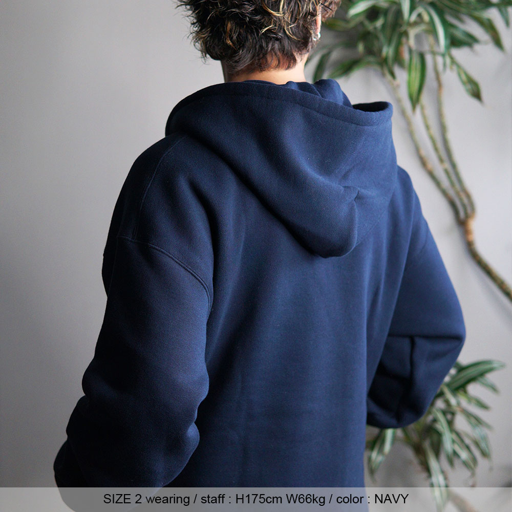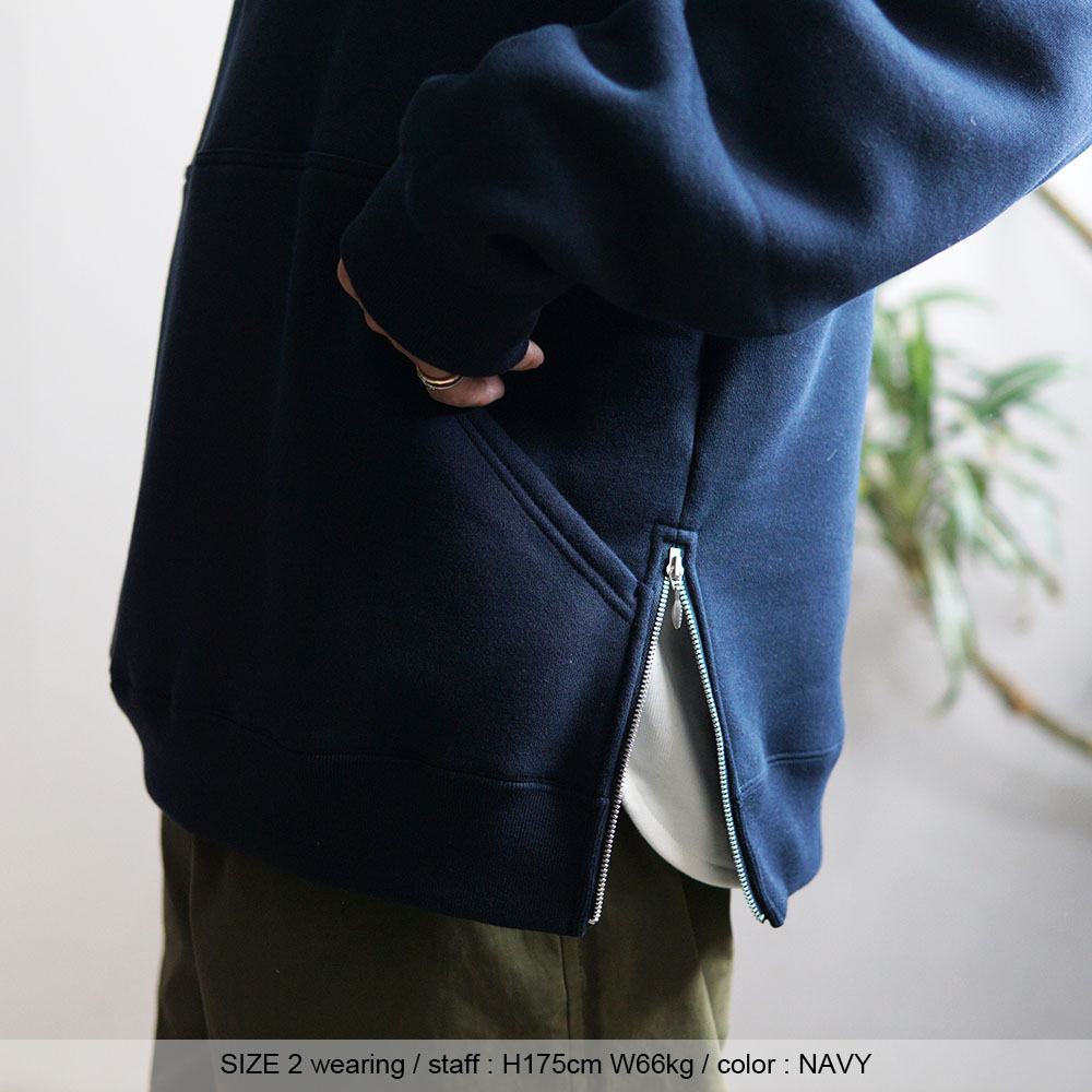 さらに着用にアレンジの幅が広がるシンプルなプルオーバーフーディを表現。