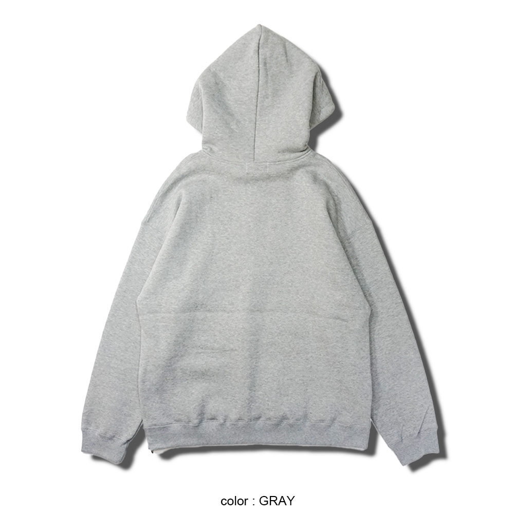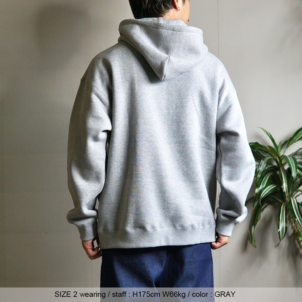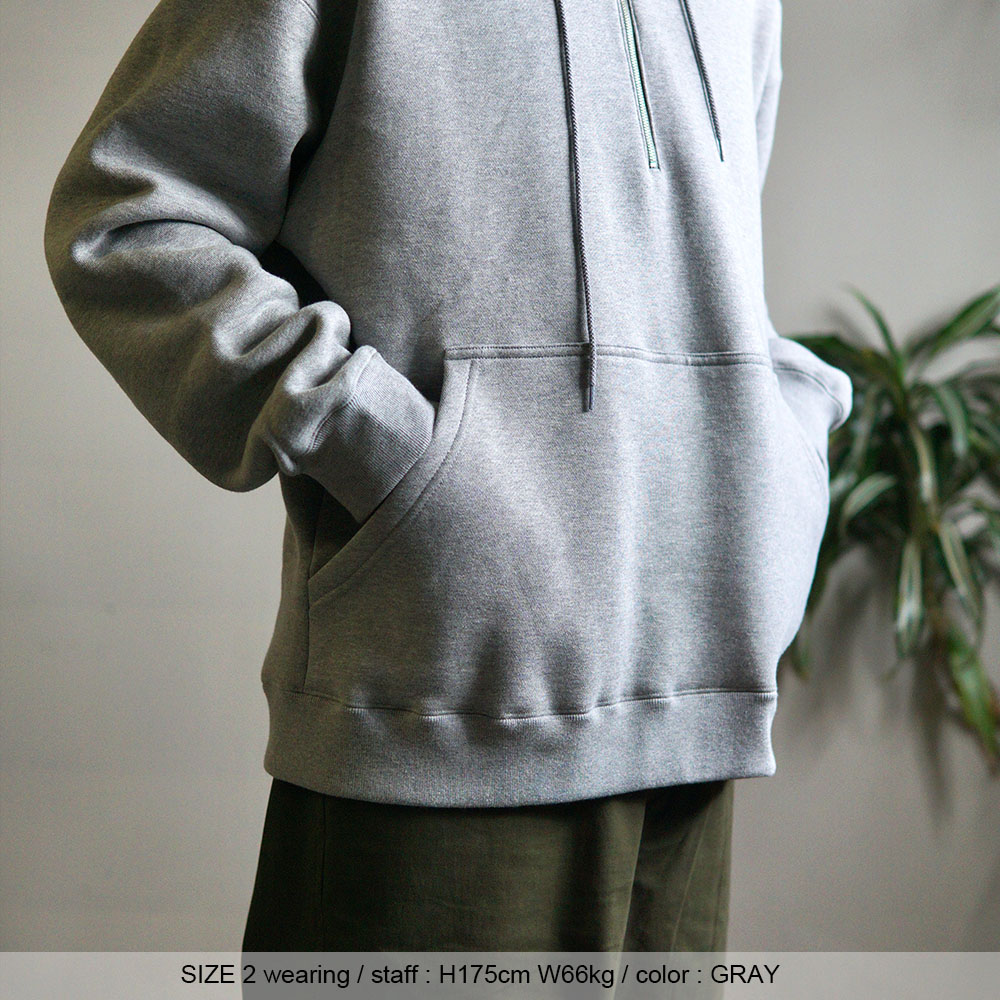 さらにフロントポケットは大きめのカンガルーポケットにすることで、 実用性のみでなく普遍的なプルオーバーフーディに無二のスパイスをくわえた1着です。