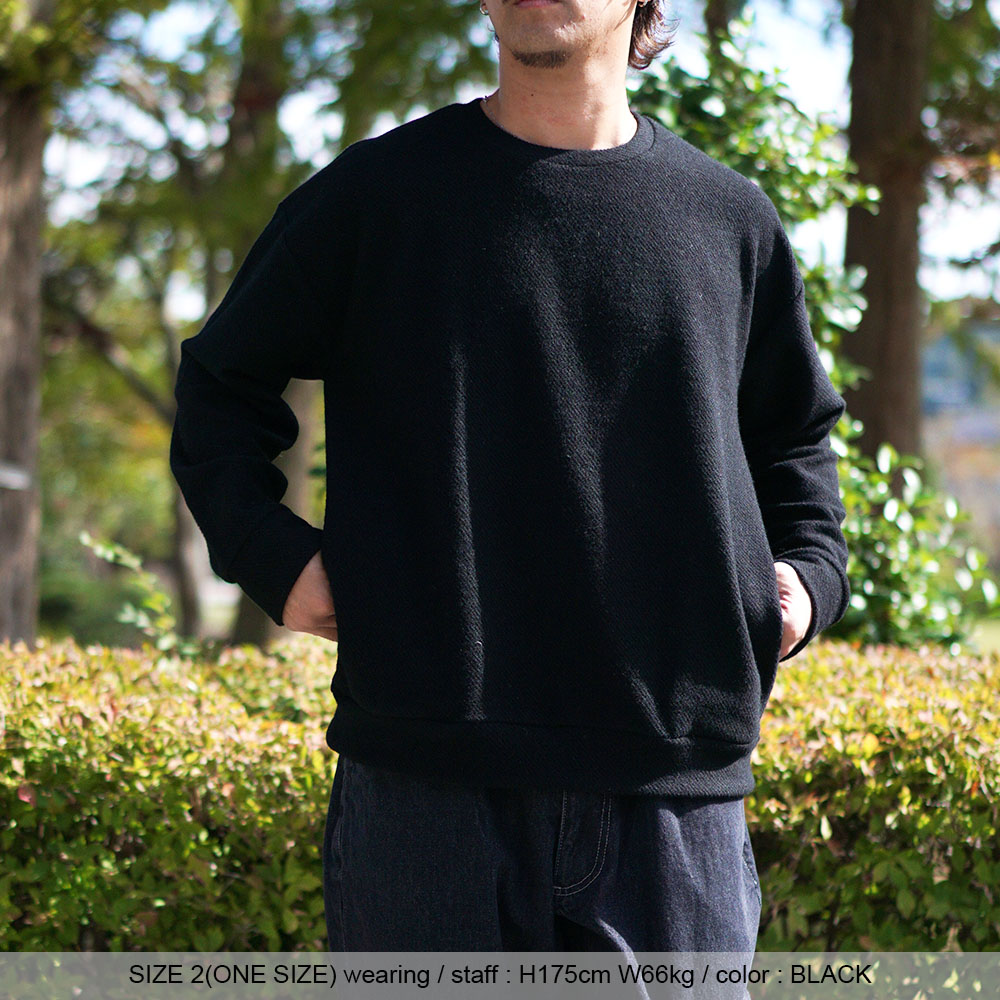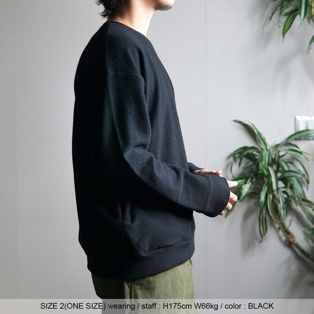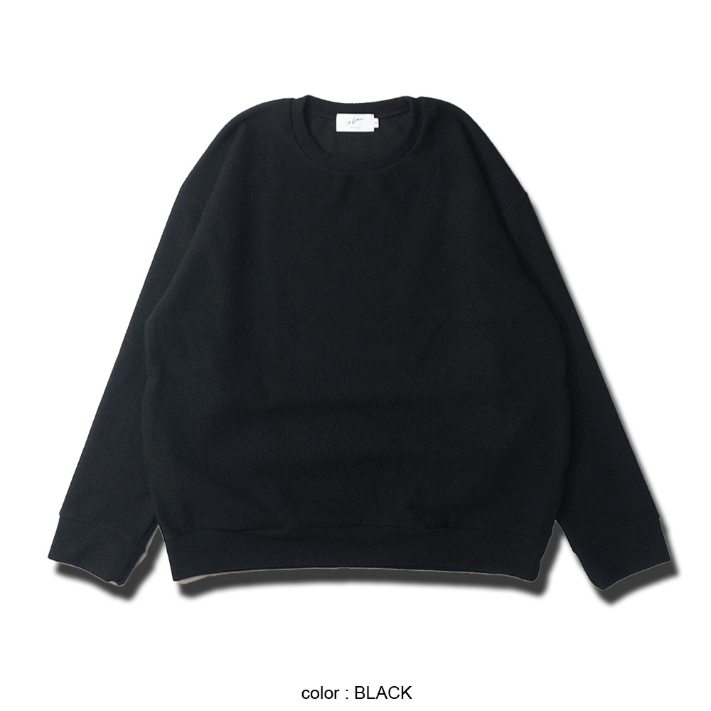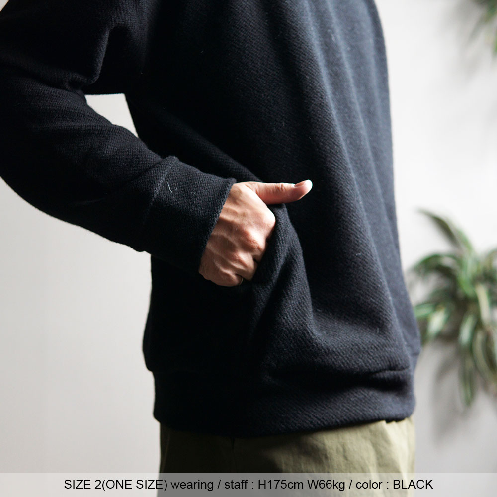 いわゆるスウェットよりも光沢感や毛羽があることで温かみある顔立ちですが、 気温やシーンで「ニットを着るほどじゃない日」にも袖を通しやすい丁度良い仕上がり。