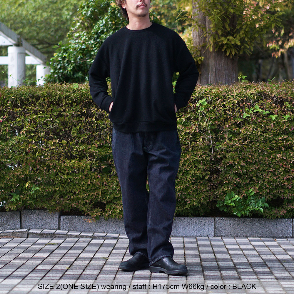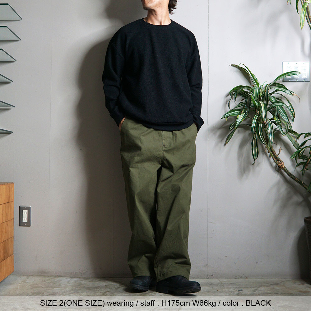 ・サイズ2・・・肩が落ちたリラックス感に、インナーを着込んでも着膨れて見えないワイドな設計です。 それでいて着丈は長すぎないのでだらしなさはなく、上からジャケットを羽織ったり運転などにも干渉しないフォルム。 メンズの推奨身長170~180m以上の方で、オーバーサイズの着こなしを楽しみたい方におすすめです。