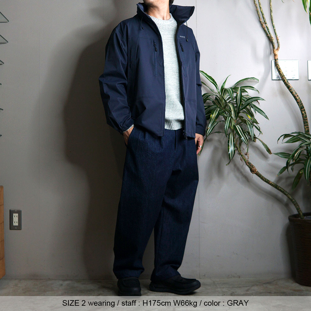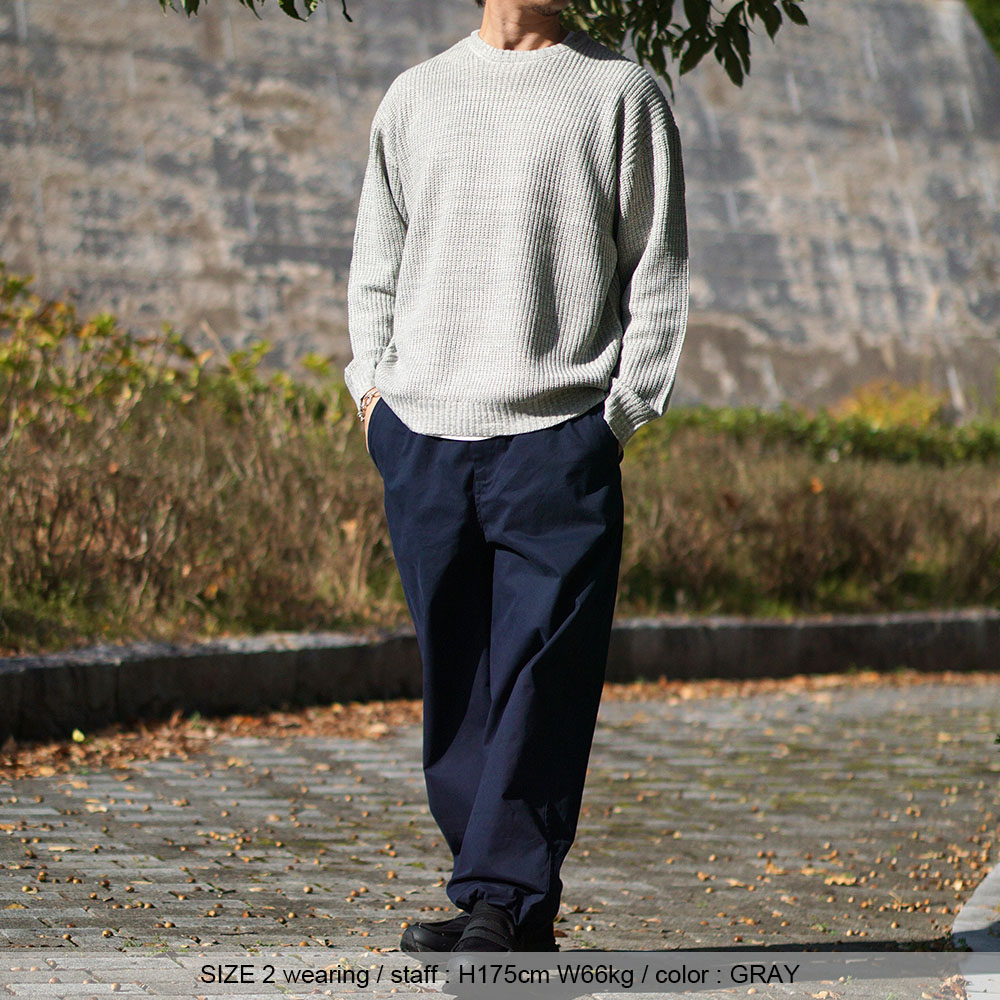 ・サイズ2・・・ドロップショルダーとワイドな身幅が、ラフでざっくりとした着用感を味わえるサイズ感です。着丈はヒップがほぼ隠れる長さで、袖周りにもゆとりがでるのでサイズ1と比較すると立体感あるシルエットで着れました。 メンズの推奨身長170~180m以上の方で、よりオーバーサイズの着こなしを楽しみたい方におすすめです。