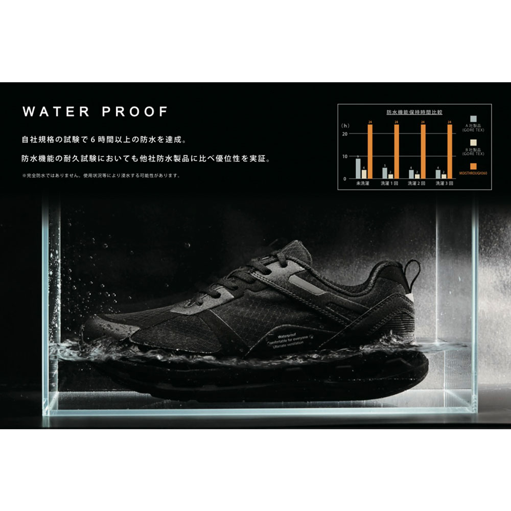 雨の日も晴れの日も最適なパフォーマンスを発揮する必要な機能だけを、MOISTHROUGH360のシューズたちに落とし込む。