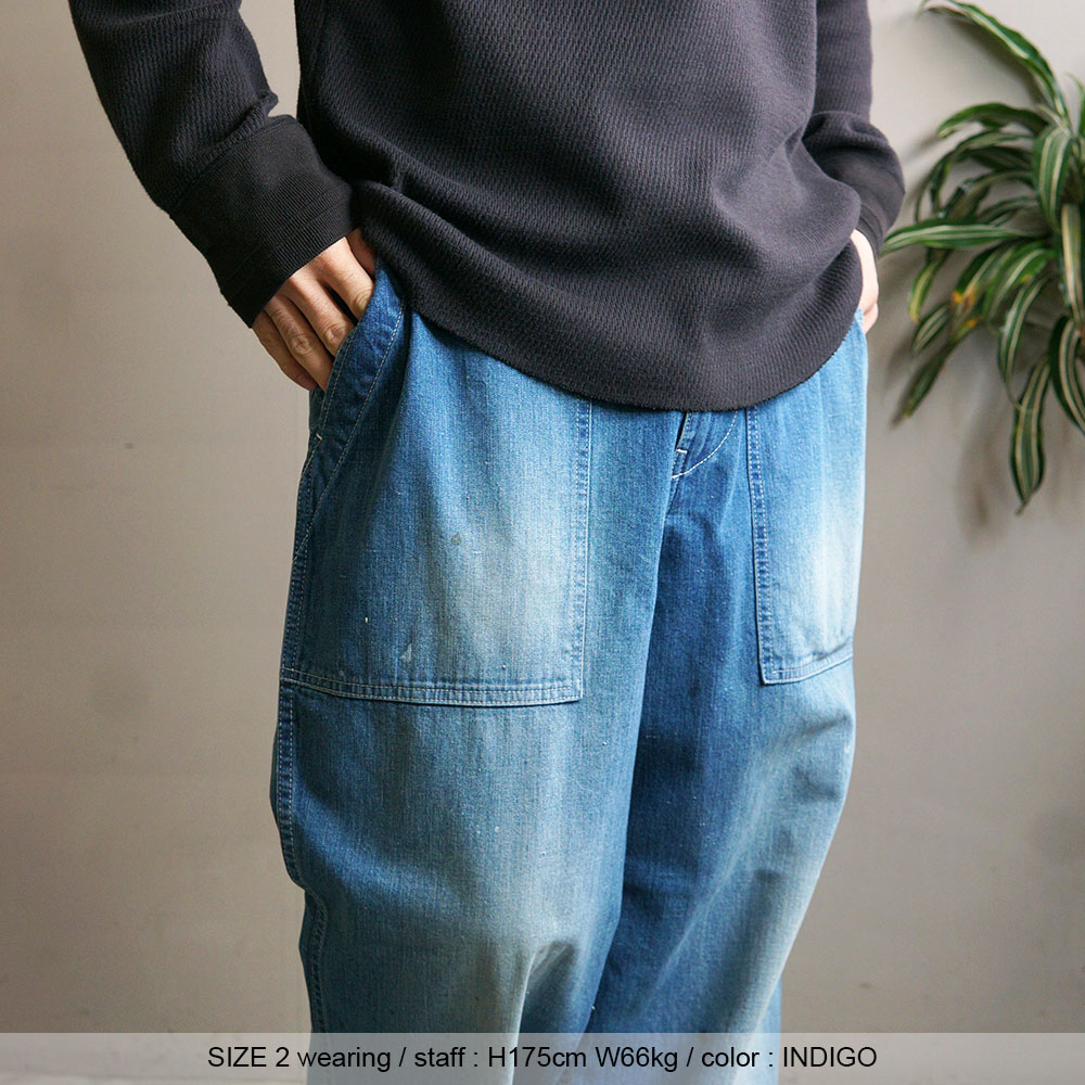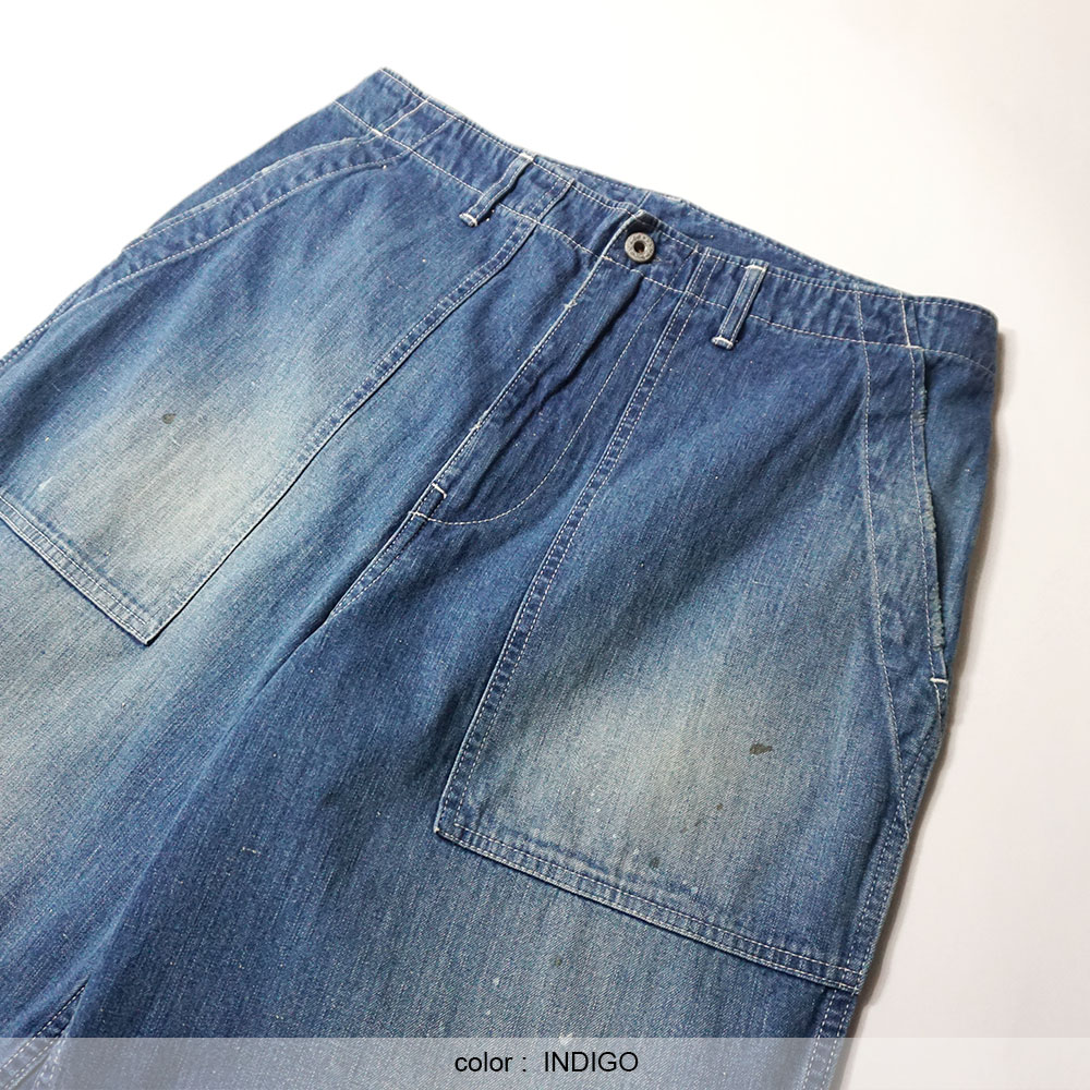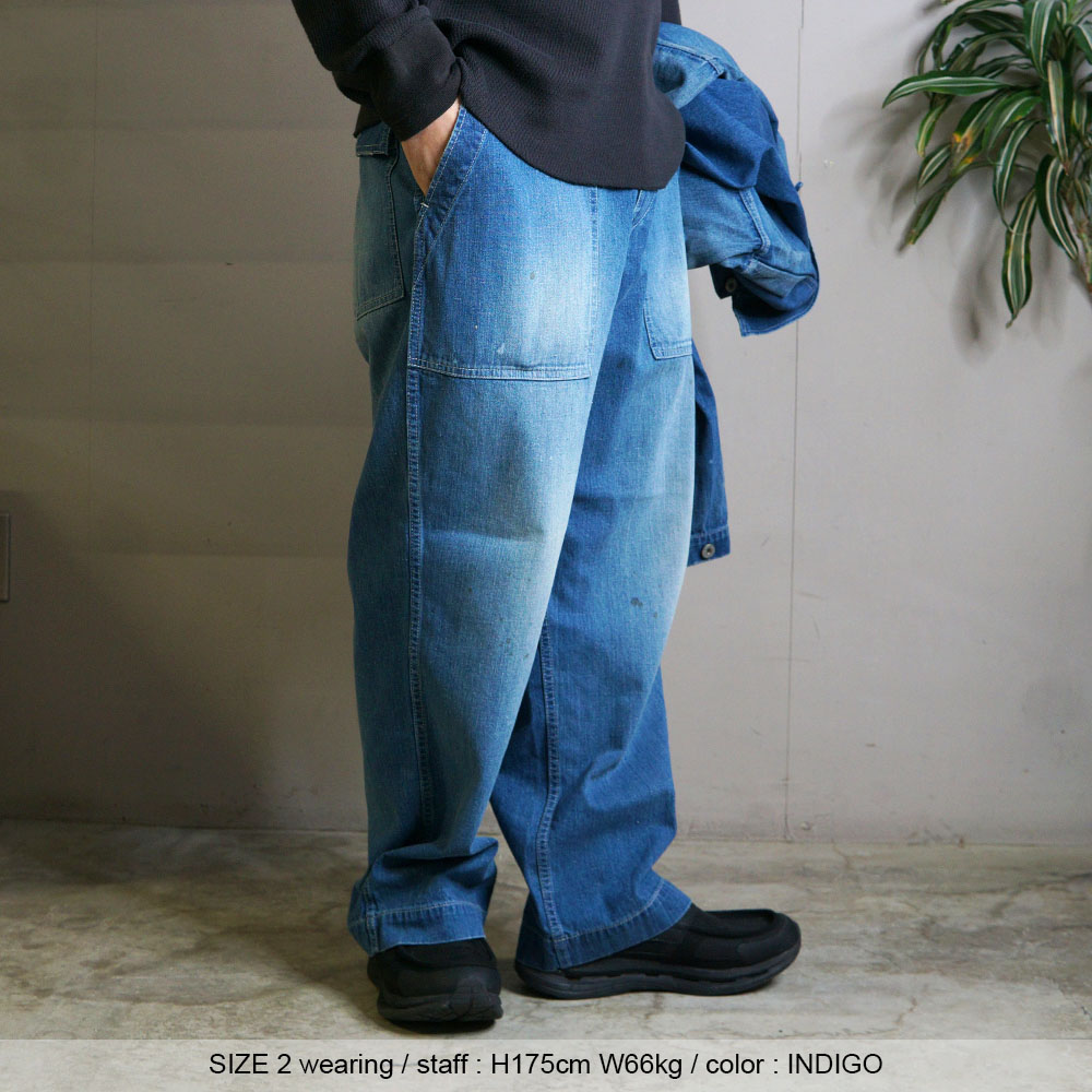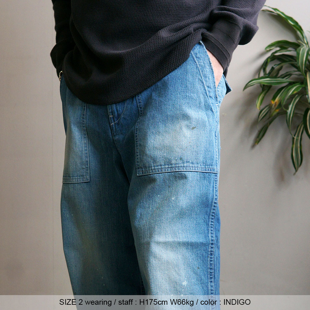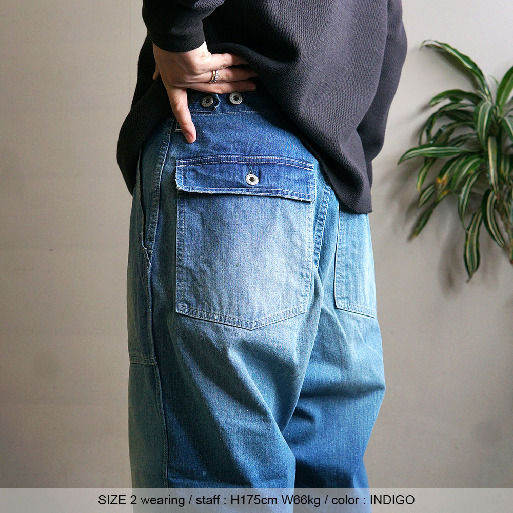 鮮やかなウォッシュデニムでミリタリーファティグーを再現した新型パンツ。
