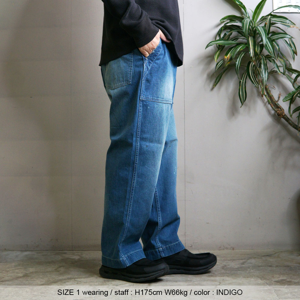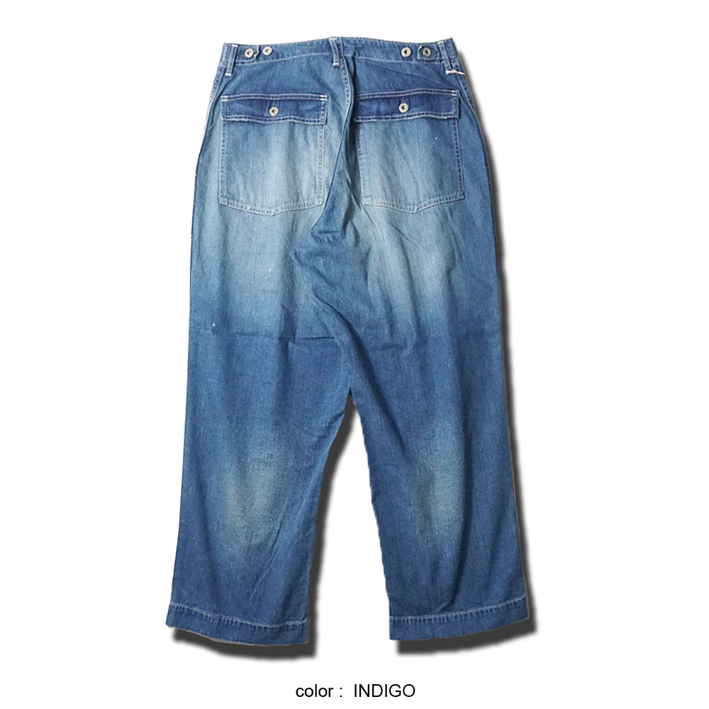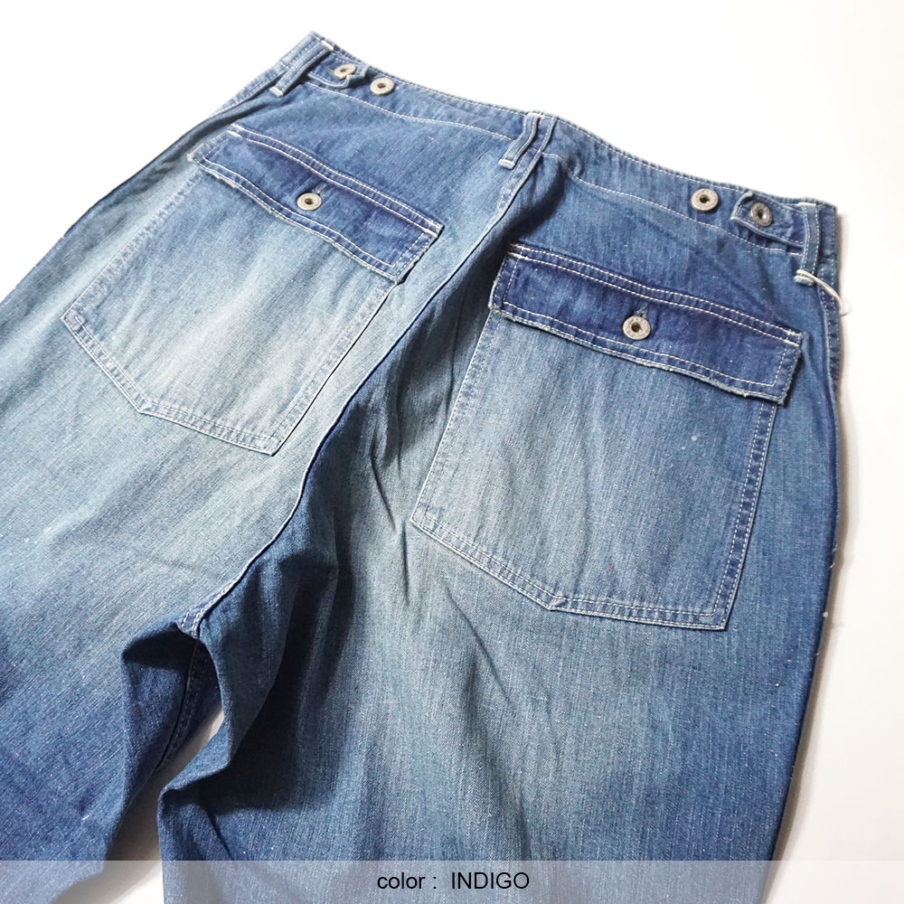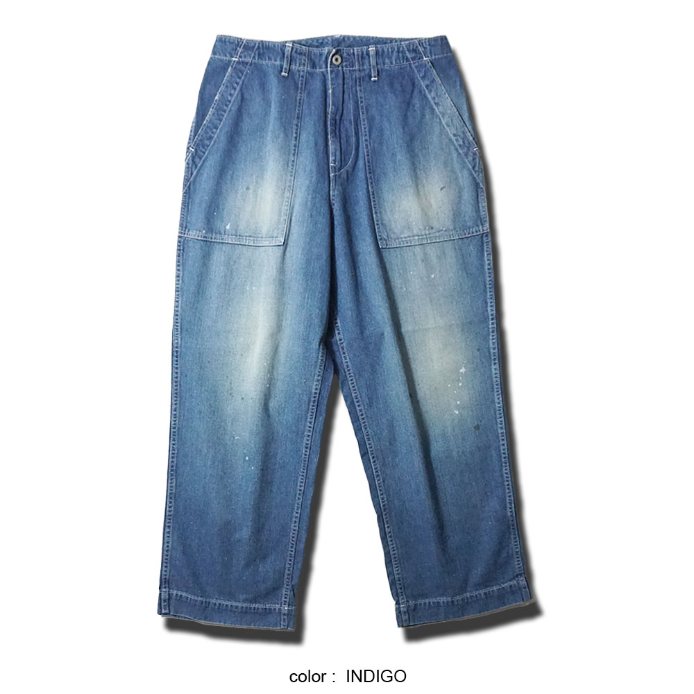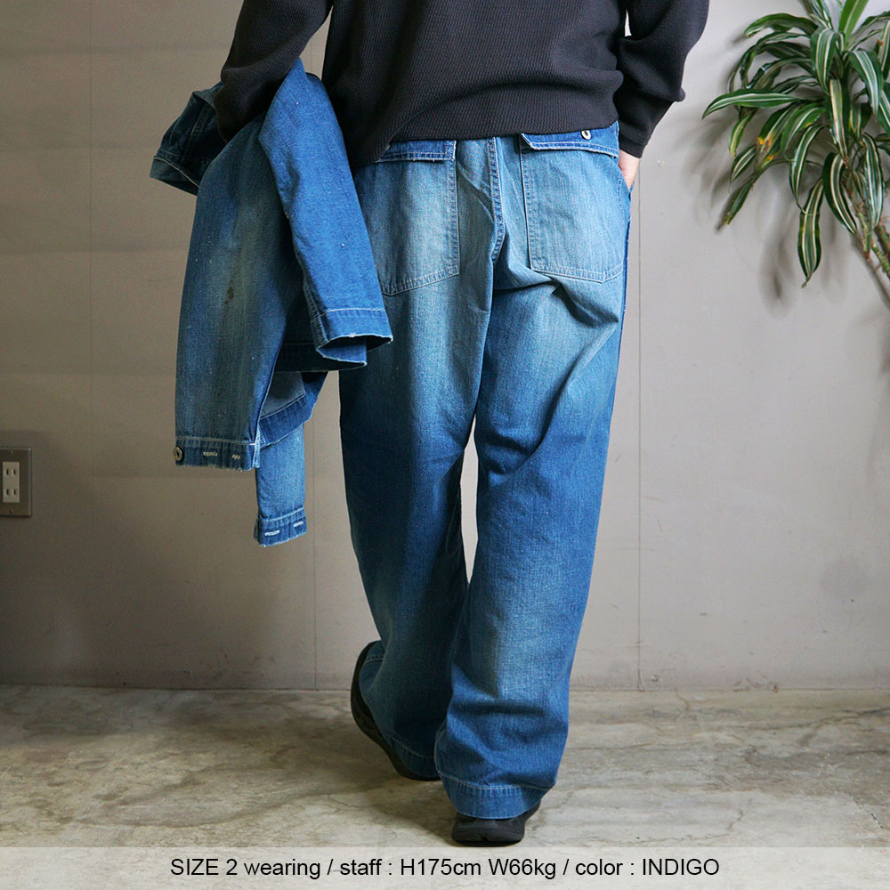 鮮やかなウォッシュデニムでミリタリーファティグーを再現した新型パンツ。
