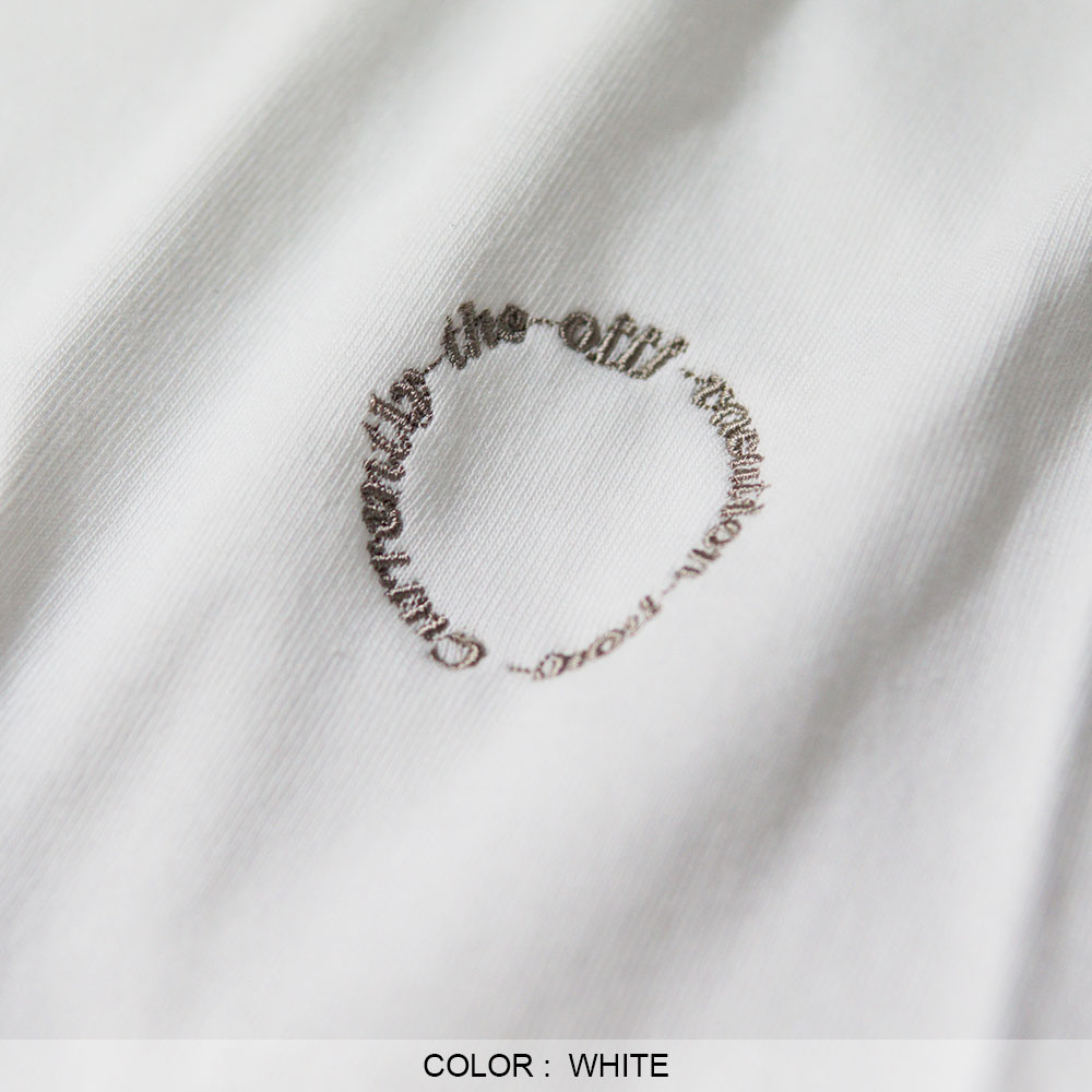 裾には、メゾンブランドをも手がける鯖江の工場で施された刺繍、 “Currently the offf – vacation now”をサークルモチーフに配置。