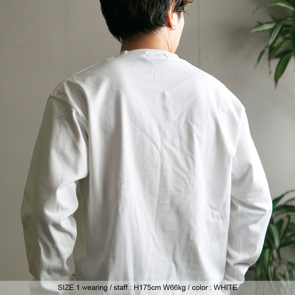 ・サイズ1・・・肩が自然に落ちるドロップショルダーで、全体にすっきりとまとまるフィッティングです。 身幅には程よいゆとりがあり、インナー用途で着用しても窮屈さがなく、アクティブにも着やすいサイズ感。 メンズの推奨身長165~180m迄の方で、よりすっきりと着こなしを楽しみたい方におすすめです。