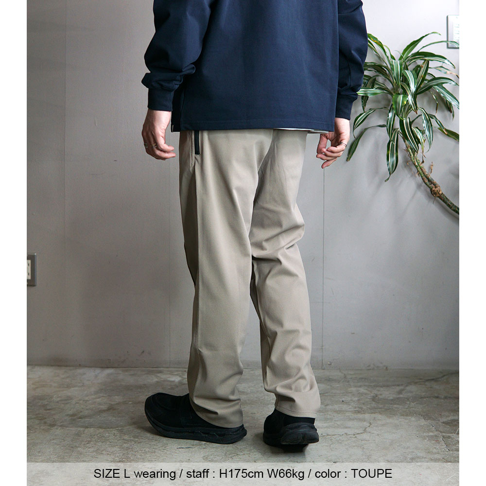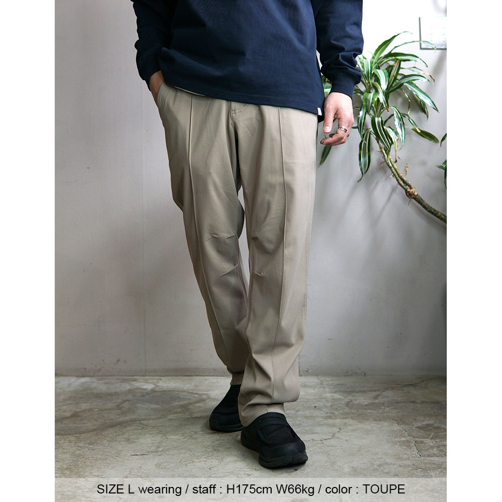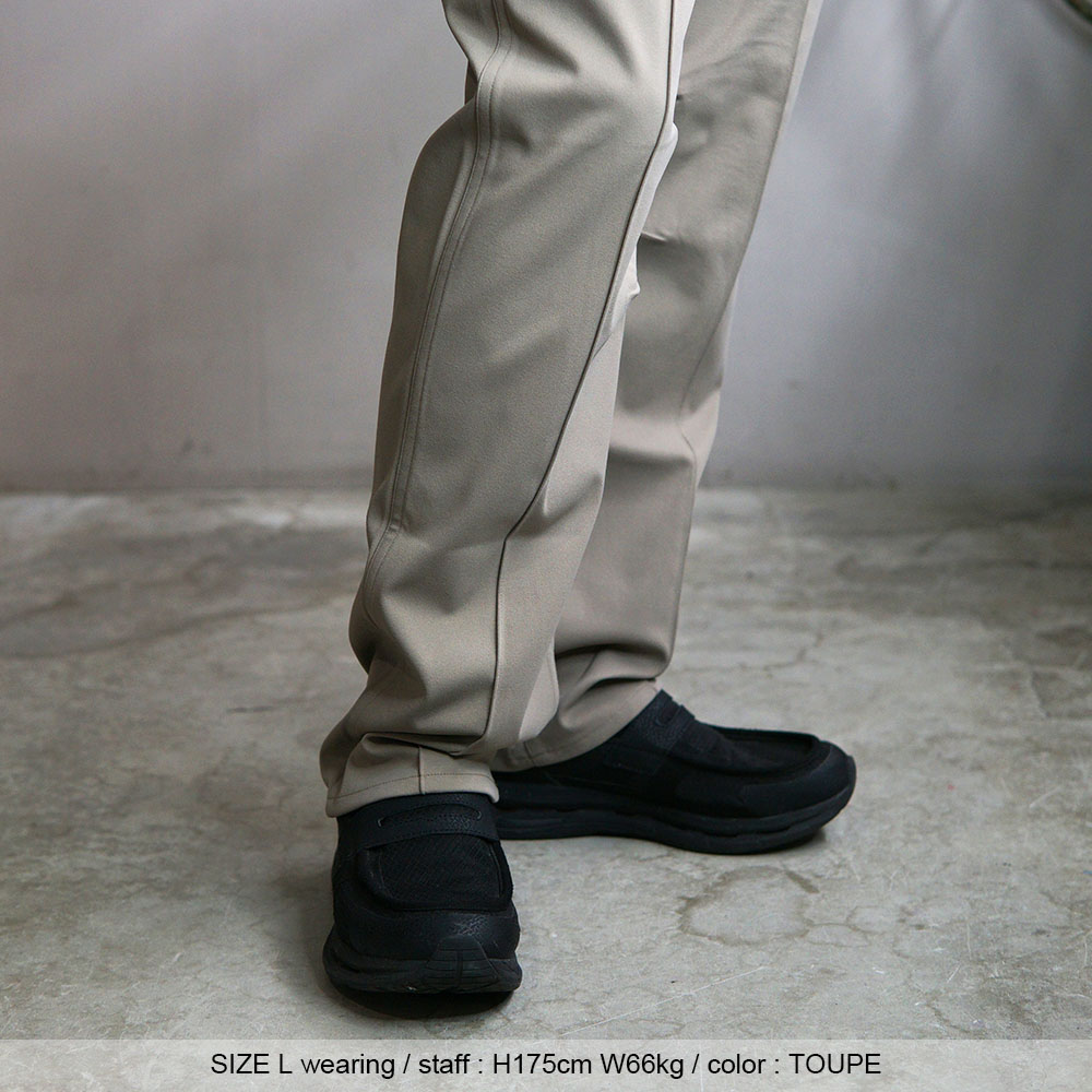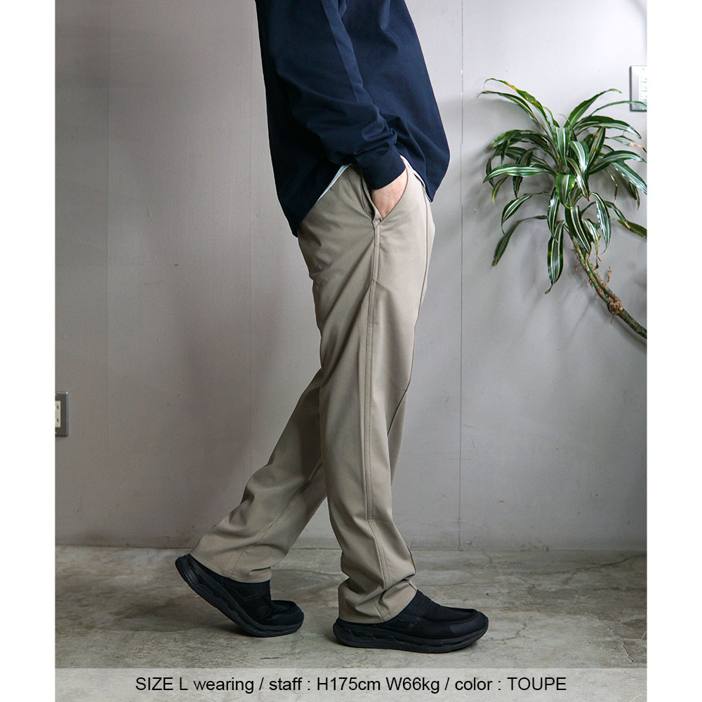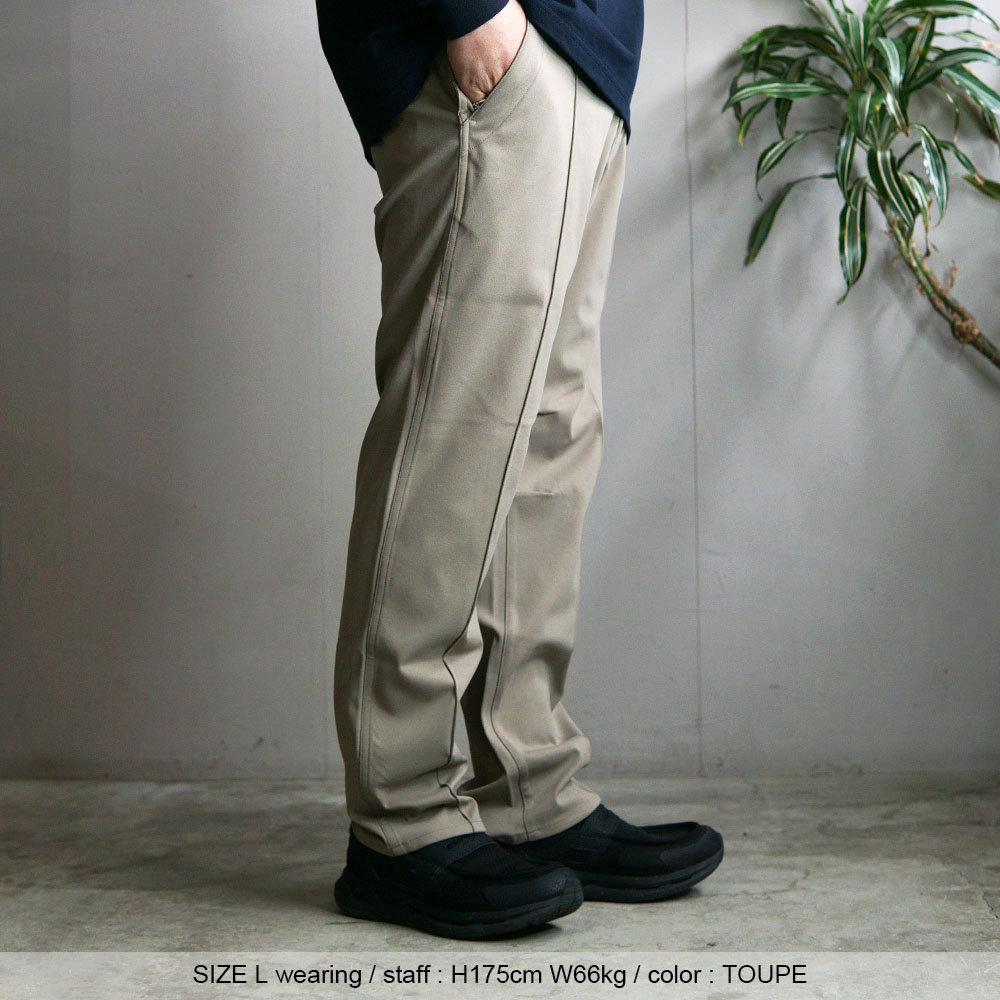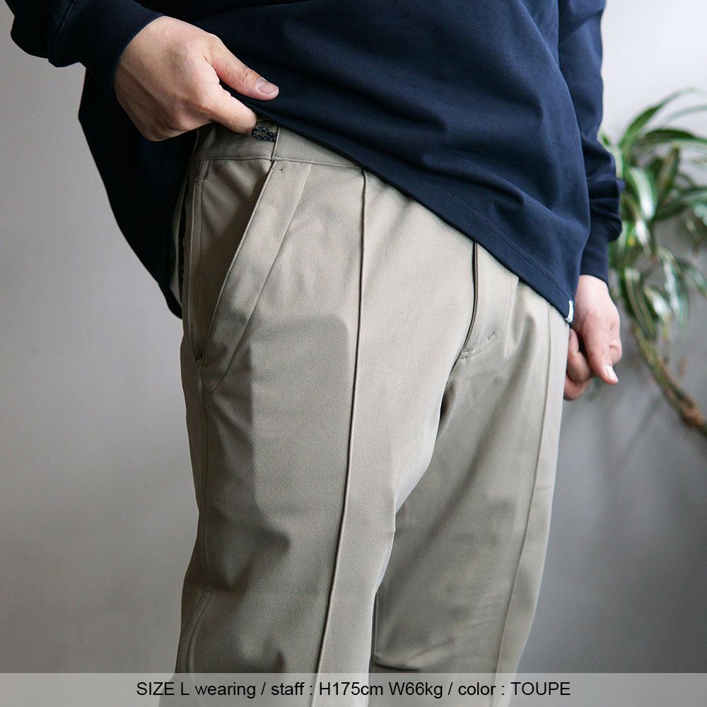 まるでスウェットパンツのようなイージーさがありつつも、 センタークリーツは縫い付けてあるためアイロン要らずで、 美しいシルエットが相まってスラックスライクなビジュアルで完成されています。