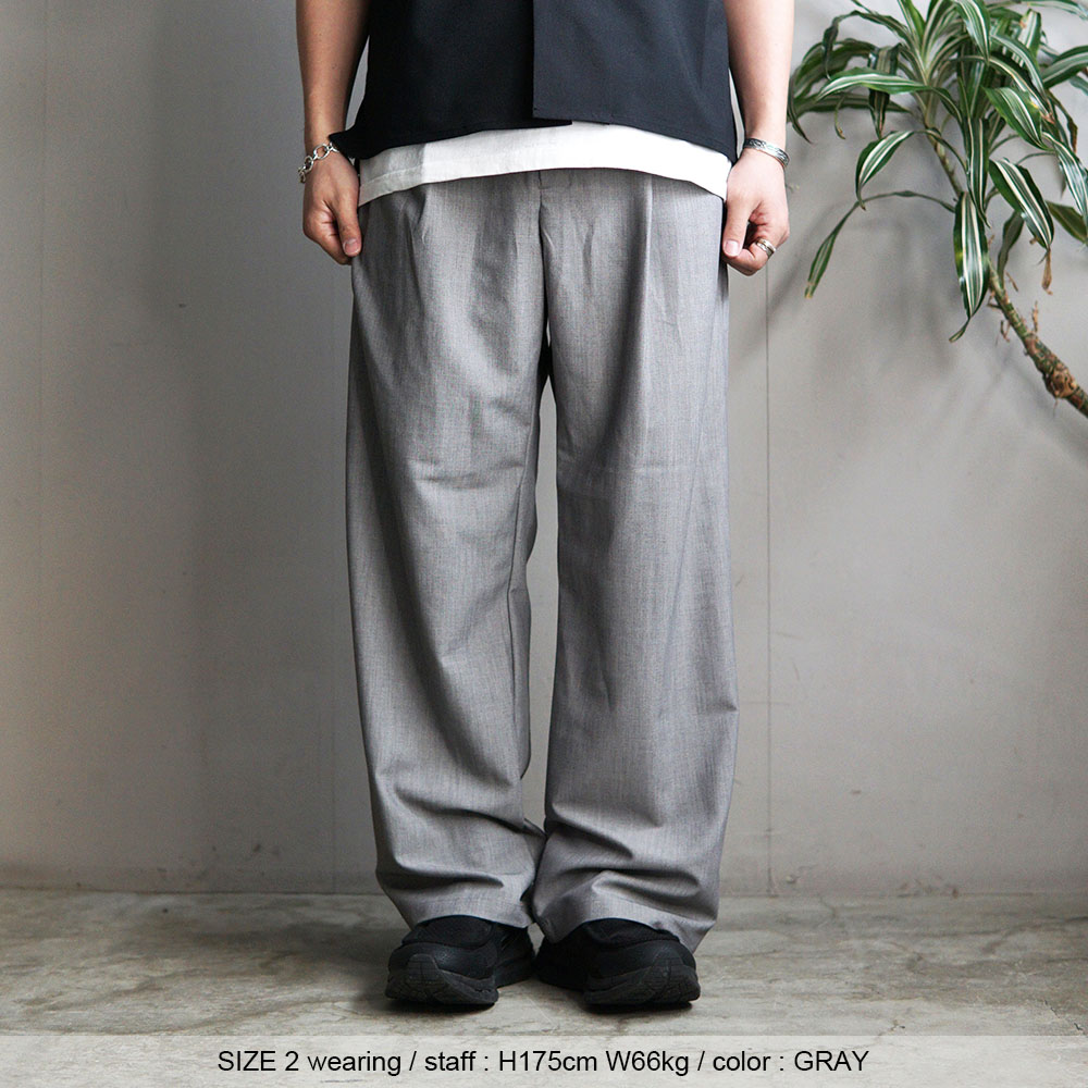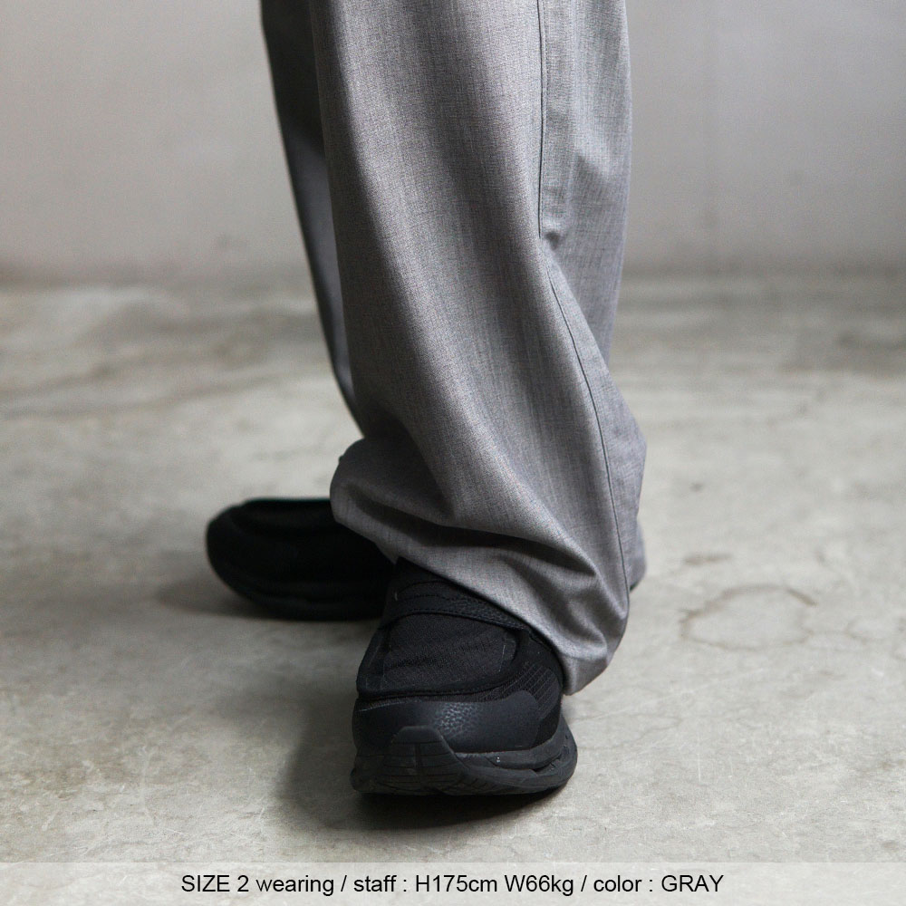 ・サイズ1・・・ウエスト・ヒップともに程よく余裕がありつつも、腰回りがスッキリ見えるレギュラーフィットな着用感です。カーブシルエット特有の立体感はしっかり出ますが、太さが強調されすぎないため、ワイドパンツを初めて履く方にもおすすめ。 推奨身長は170cm〜175cm前後の方で、今っぽさと穿きやすさを両立したいという方にサイズ1がお勧めです。