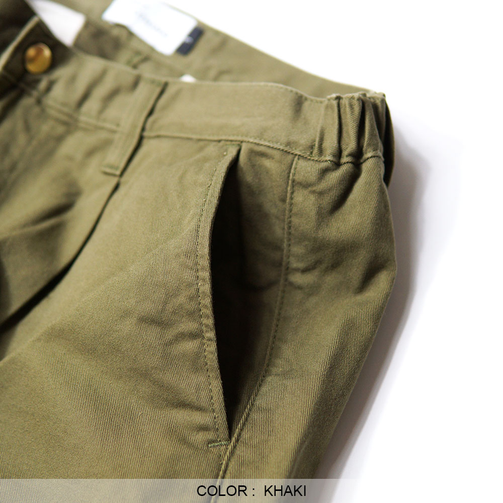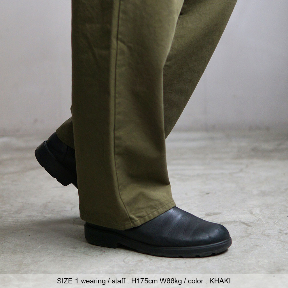 生地にしっかりと目を詰めたチノツイル生地にウォッシュ&タンブラー加工を施し、 余分な硬さをほぐすことで手に取ってすぐから柔らかな足通しを実現。