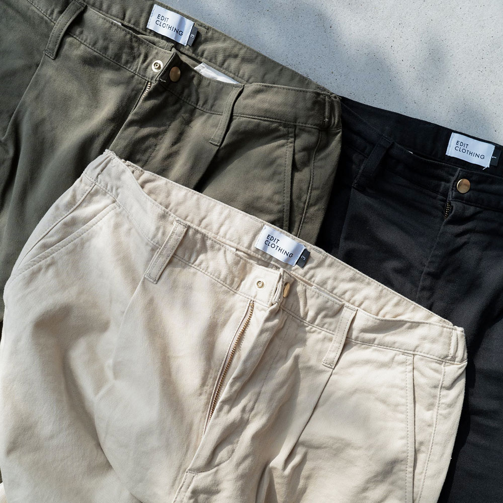 定番を尽くしたチノパンツというカテゴリから、 EDIT CLOTHINGらしい抜け感とデイリーユースの美しさが投影された"ラフチノ"がデビューです。