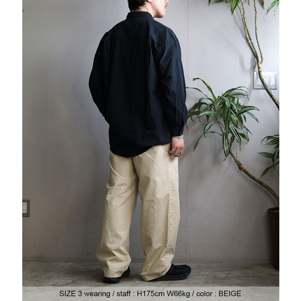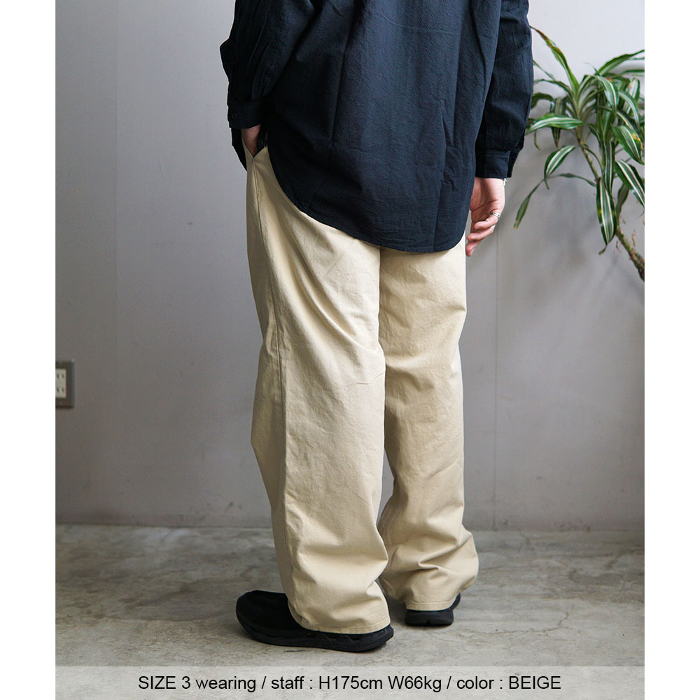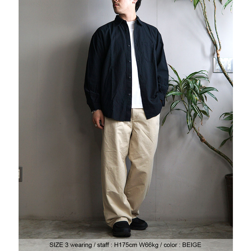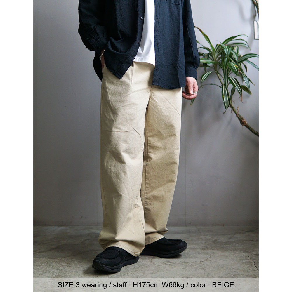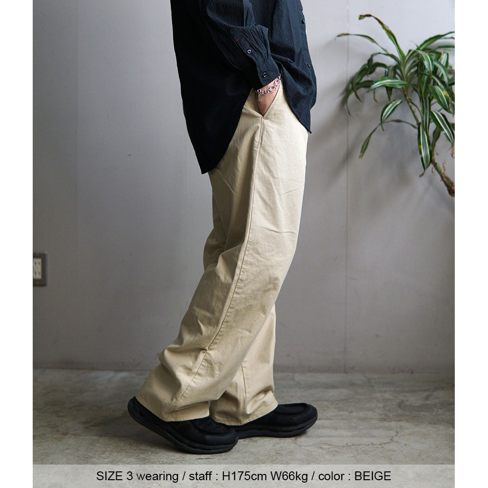 ・サイズ3(L)・・・生地のハリ感も相まって、ワイドフォルムで着用できるリラックス感のあるフィッティングです。ウエストは指が2本入るほど余裕がありますがベルトをつければ調整可、ほどよいゆとりのある太もも周りでさらにリラックスしてフォルムで着用ができます。 推奨175cm(リラックスフィット)〜180cm以上(レギュラーフィット)、ルーズに穿きたい方はサイズ3がおすすめ。