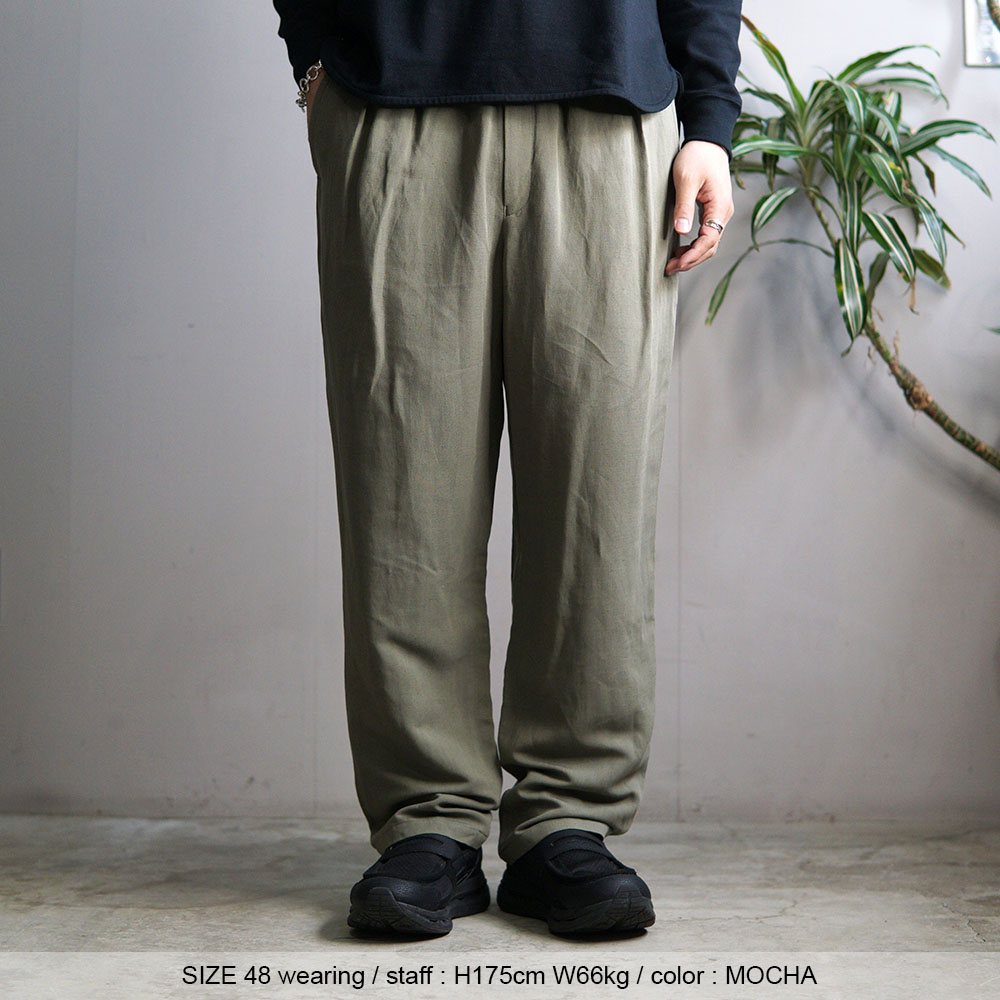 素材にはリネンのハリ感と、 レーヨンの柔らかなとろみを掛け合わせた混紡素材を使用。