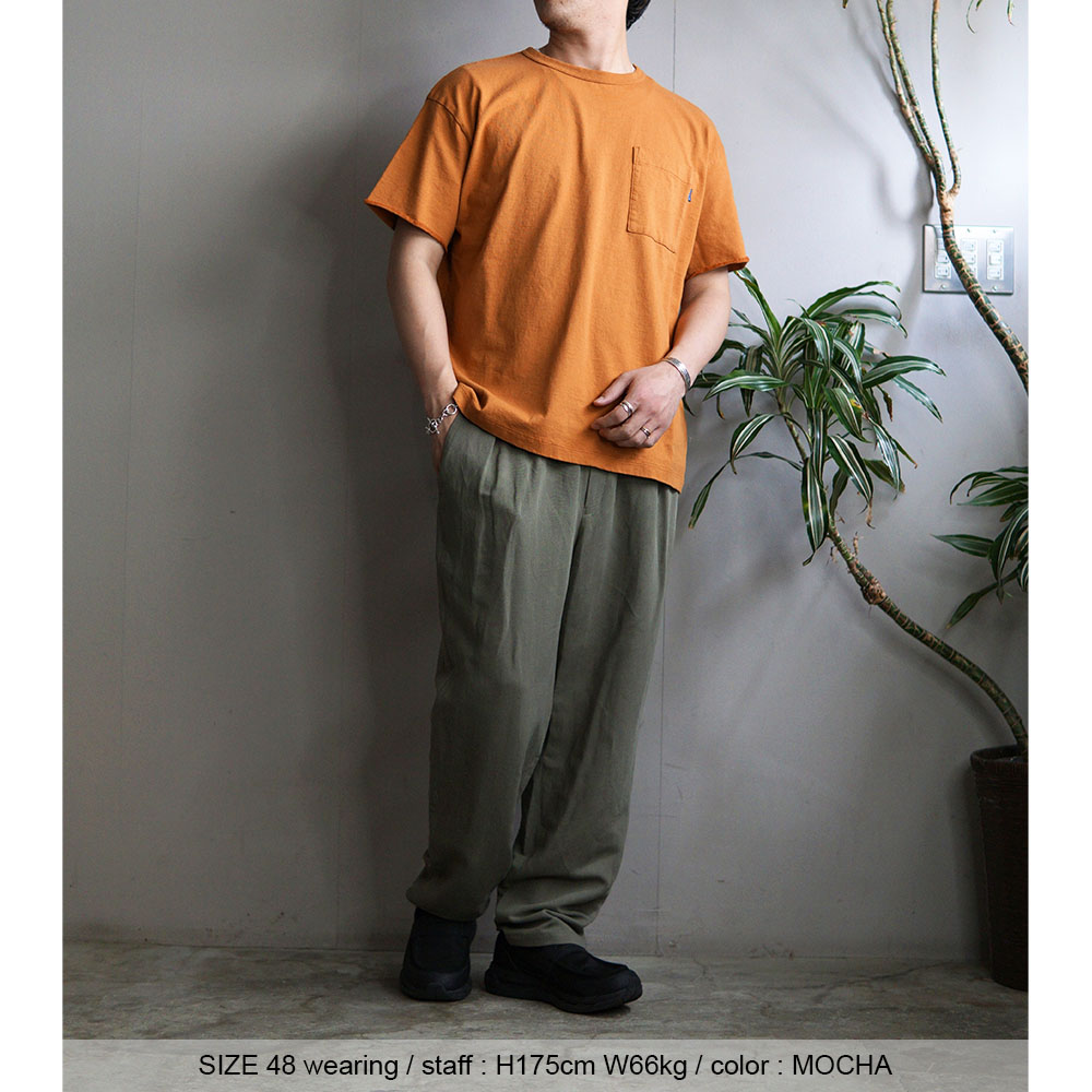 ・サイズ46・・・太もも周りにゆとりがありつつ、裾への落ち感とテーパード具合が程よいリラックス感を生むフィッティングです。 ウエストはゴムでちょうど良く、裾はシューズに1クッションかかるほどの長さで足の曲げ伸ばしも干渉しない着用感。 推奨身長は 165cm(リラックスサイズ)〜175cm前後(ジャストサイズ)の方、すっきりとした着用感で穿きたい方におすすめです。