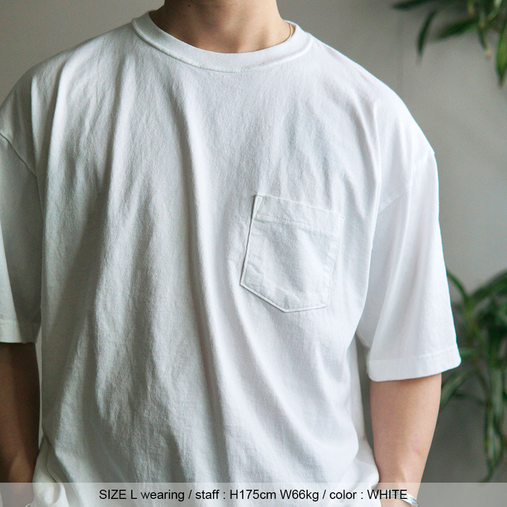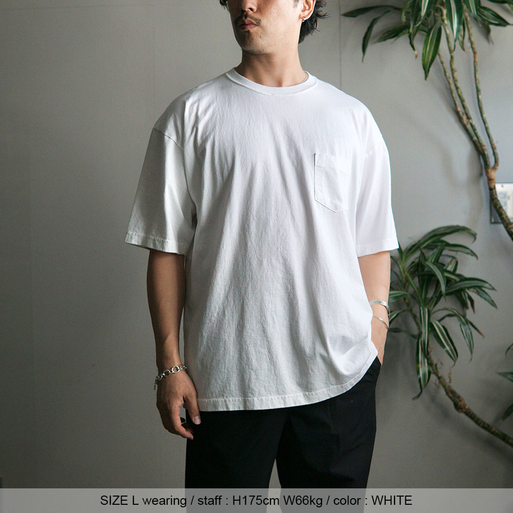 ・サイズM・・・肩がやや落ちるリラックスフィットで、身幅・着丈ともにバランスの取れたサイズ感。 1枚で着ても大きすぎず、インナー使いもしやすいです。 推奨の身長は170cm前後の方、またTシャツをよりすっきりと着たい方におすすめです。